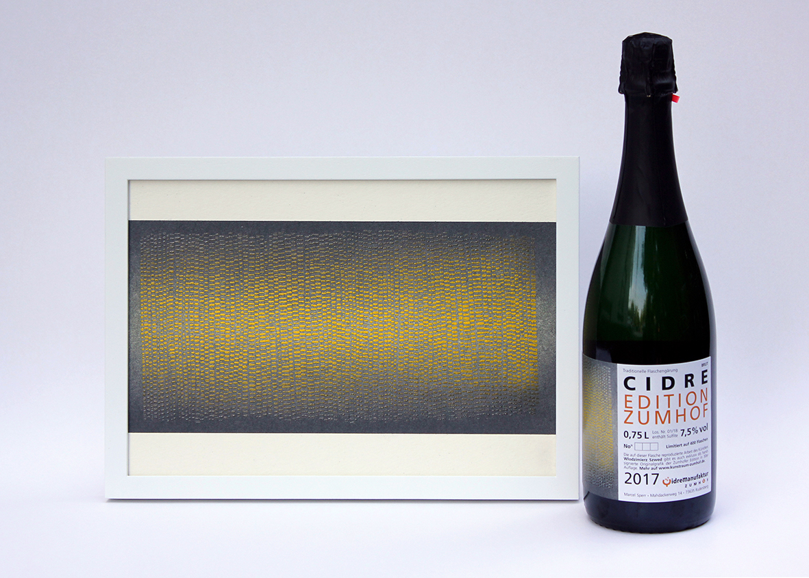 Zumhofer Cidre? Ein trockener Schaumwein der CidreManufaktur Zumhof aus Äpfeln und Birnen von Zumhofer Streuobstwiesen, hergestellt von Winzer Marcel Sperr und Freunden von Kunstraum Zumhof im traditionellen Verfahren der Flaschengärung, abgefüllt in 450 limitierte und handnummerierte Flaschen, verhilft unter dem Namen Edition Zumhof nicht nur der Apfelkultur des Wieslauftals zu neuem Glanz, sondern trägt auch die Kunst hinaus in die weite Welt, denn das Etikett zeigt jährlich wechselnd eine Abbildung der aktuellen Kunstedition!