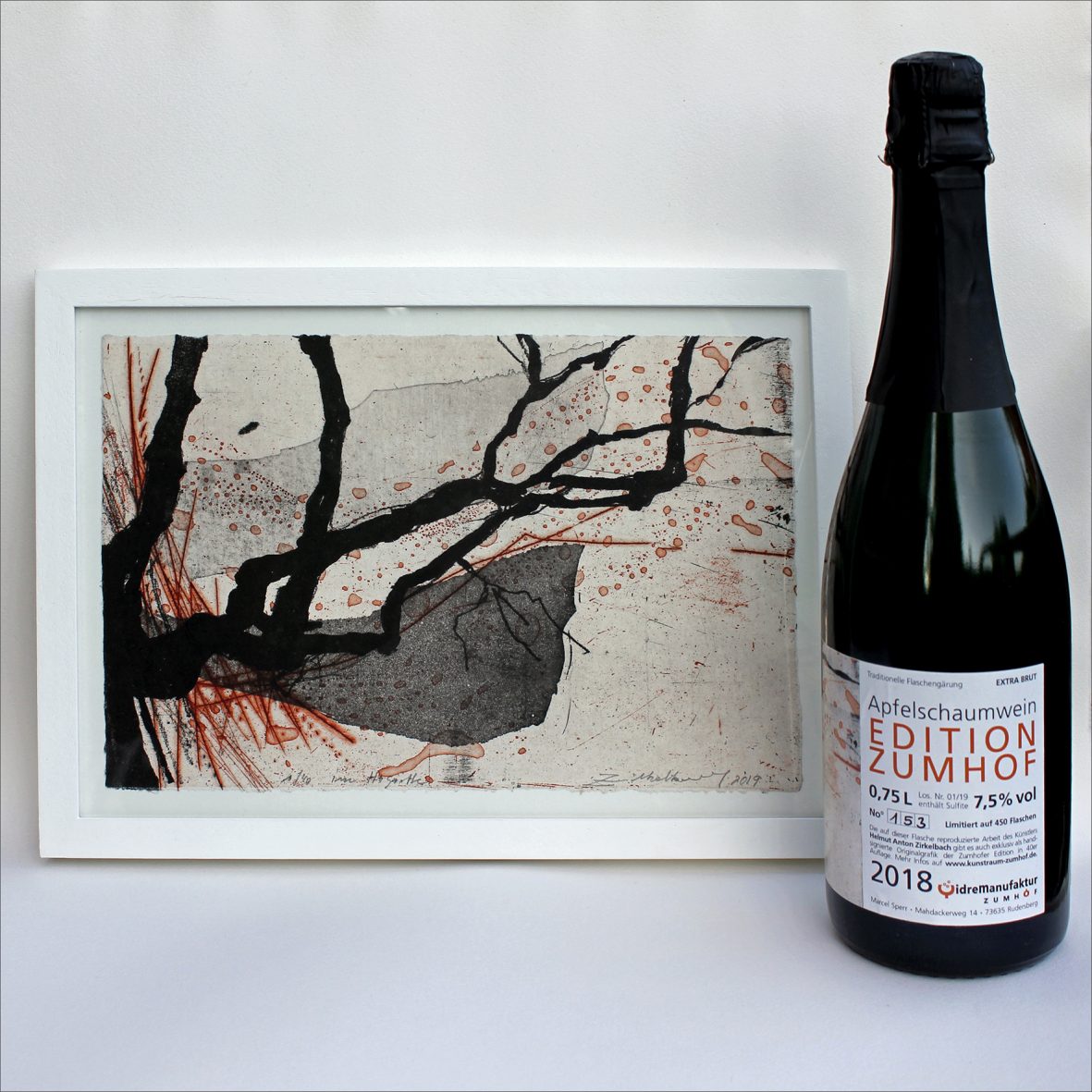 Kunstraum Zumhof e.V. ist seit 2018 Herausgeber einer kleinen, feinen Grafikedition, die zum Sammeln von Kunst ermutigen will. Die jährlich erscheinenden, originalen Werke wechselnder Künstler gibt es zum Preis von 59 Euro in 40er Auflage, nummeriert, handsigniert und fertig gerahmt im Querformat 21 x 30 cm. Dazu erhält der Käufer eine Flasche Cidre Edition Zumhof des aktuellen Jahrgangs, mit der man, nach dem Aufhängen in den eigenen vier Wänden, auf die Kunst anstoßen darf.